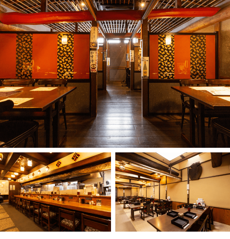 大正から昭和初期に建てられた酒蔵を改装。天井は高く、立派な梁が印象的な店内は酒蔵の雰囲気を残した趣のある空間です。蔵座敷だけでなく、おひとりさまにもご利用いただきやすいカウンター席のほか、最大40名様までお集まりいただけるテーブル席もございます。