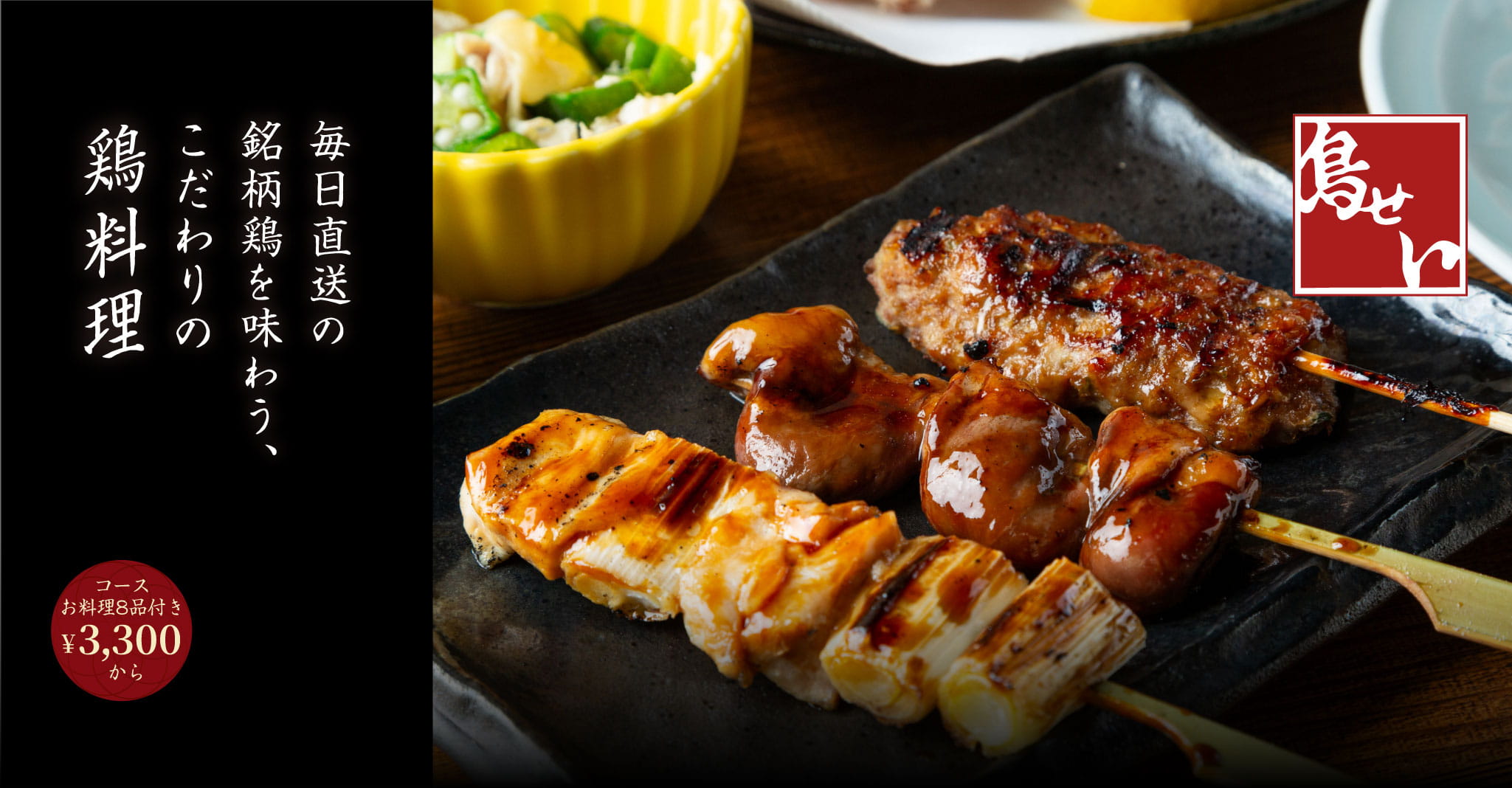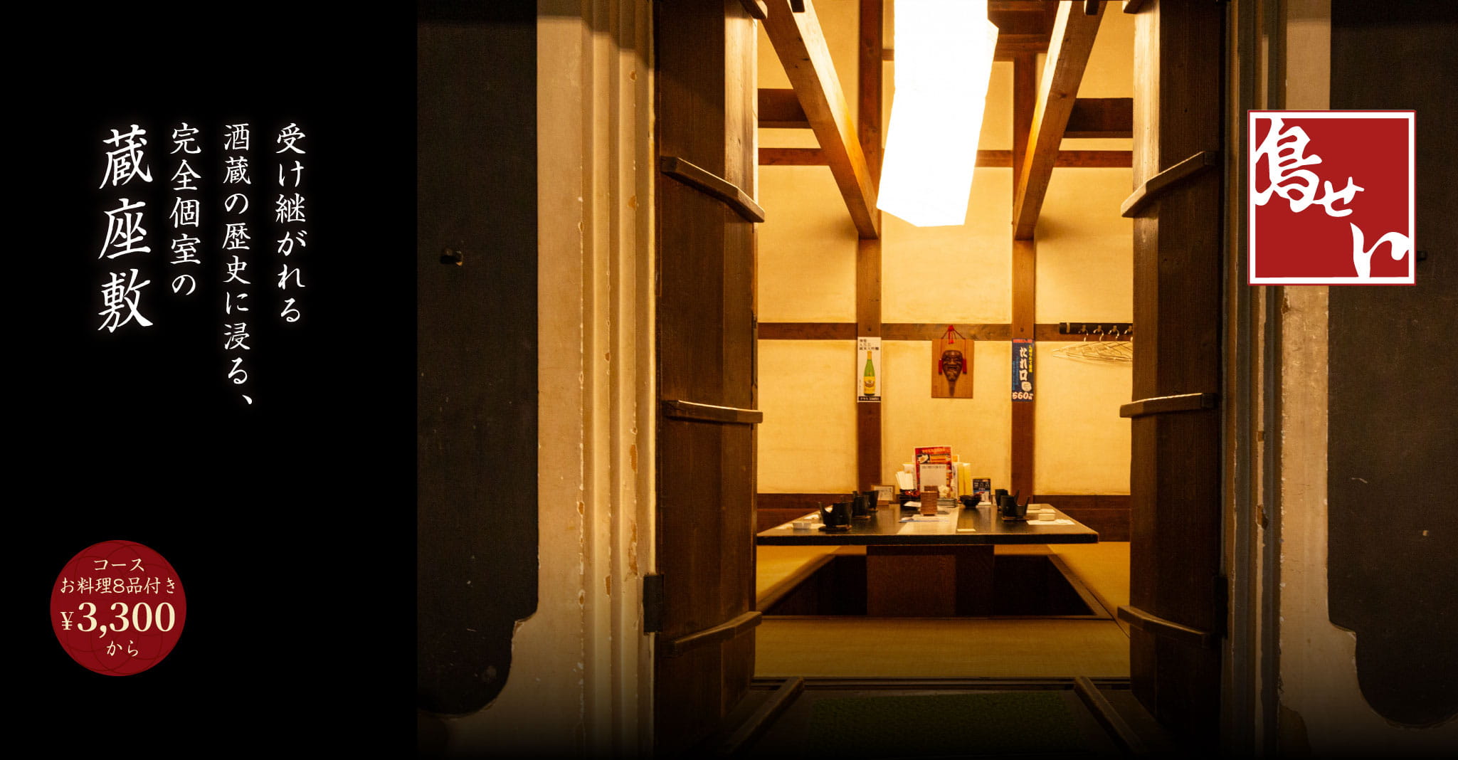 様々なシーンのご宴会にご利用いただけるコースメニューもご用意しております。串焼きなどの鶏料理をメインにした3,300円のお手頃プランから、特別な日のお食事や接待にもおすすめの蔵座敷専用コース6,800円まで、用途やご予算に合わせてお選びいただけます。