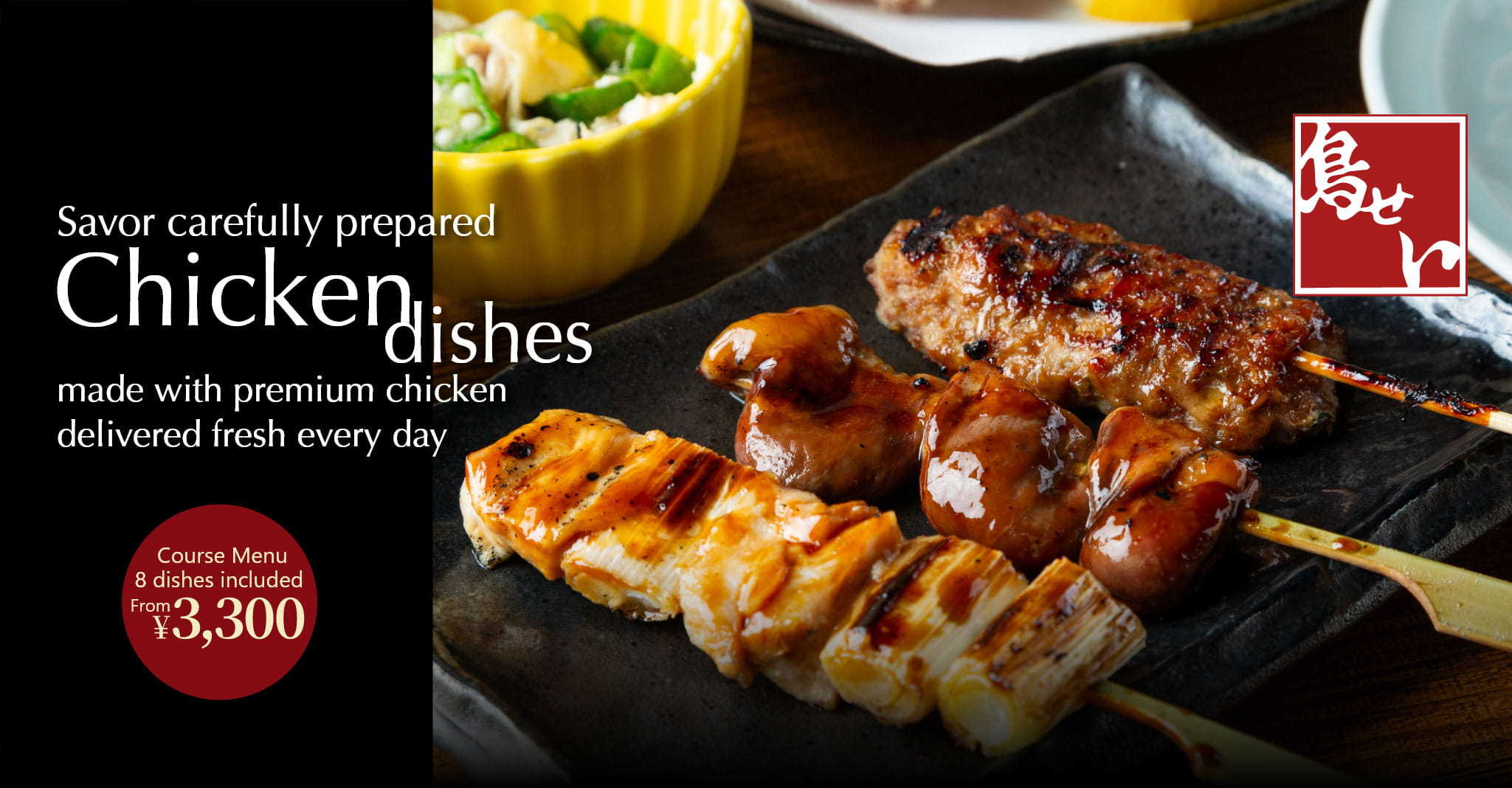 Our restaurant uses domestically raised premium chicken delivered fresh every day. Thanks to its freshness, we can serve dishes such as chicken sashimi (Winter only) , while our carefully grilled skewers are also a specialty. The savory grilled chicken is generously coated with our special sauce, which is simmered with sake to bring out an elegant sweetness and rich umami.*Please note that some menu items are not made with domestically raised premium chicken.