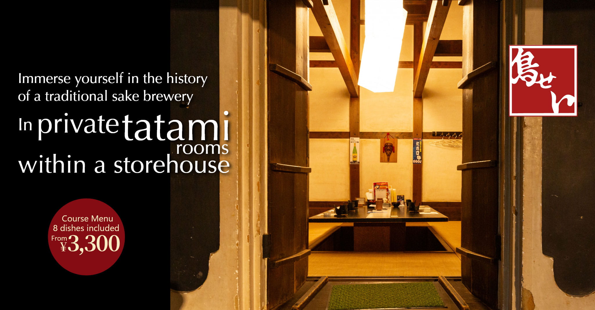 The renovated brewery space is available as a fully private room with sunken kotatsu seating. Beyond the heavy doors lies a calm and atmospheric room that reflects a long history. Reservations are available only for groups of 4 to 8 people booking the brewery course (¥6,800). It is an excellent choice for special occasions and gatherings.